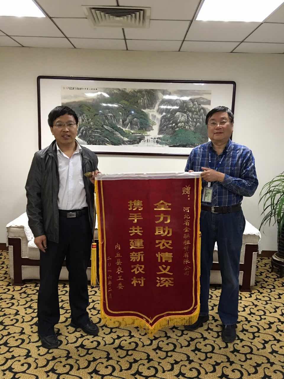 一年來,河北金租駐村工作隊與孫家坡村的干部群眾打成一片。在省市黨組織部門的抽查、突查中均未出現(xiàn)漏崗,中秋節(jié)、元旦等假日也堅守崗位,受到省國資委領(lǐng)導(dǎo)、各級扶貧辦和村民的一致好評。駐村工作隊榮獲內(nèi)丘縣扶貧辦、農(nóng)工委頒發(fā)的“2015年度扶貧工作先進集體”稱號,工作隊曹津生榮獲“2015年度扶貧工作先進個人”稱號。近日,內(nèi)丘縣農(nóng)工委特向公司贈送一面錦旗,表達了“全力助農(nóng)情誼深,攜手共建新農(nóng)村”的感謝之情。